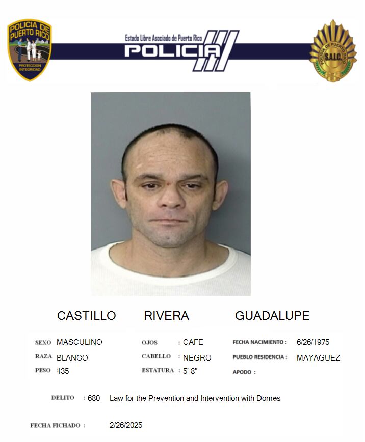 Las autoridades informaron sobre el arresto de un hombre, identificado como Guadalupe Castillo Rivera, quien figuraba en la lista de los mas buscados del área de Mayagüez. Este fue entregado por agentes, de la División de Extradiciones del Departamento de Justicia de Puerto Rico, en el Aeropuerto Internacional Luis Muñoz Marín, de Carolina.