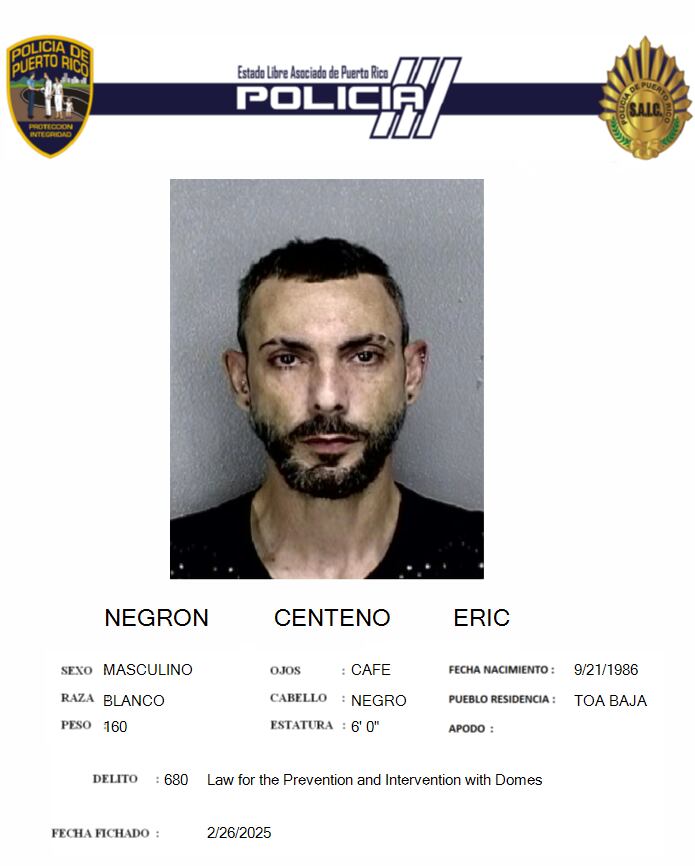 Agentes del Negociado de Inteligencia y Arrestos Especiales de la Policía de Puerto Rico del área de Bayamón, informaron sobre el arresto de un hombre, identificado como Eric Negrón Centeno, de 38 años y residente en Toa Baja, por hechos ocurridos el pasado miércoles, 19 de febrero de 2025, en el municipio de Corozal.
