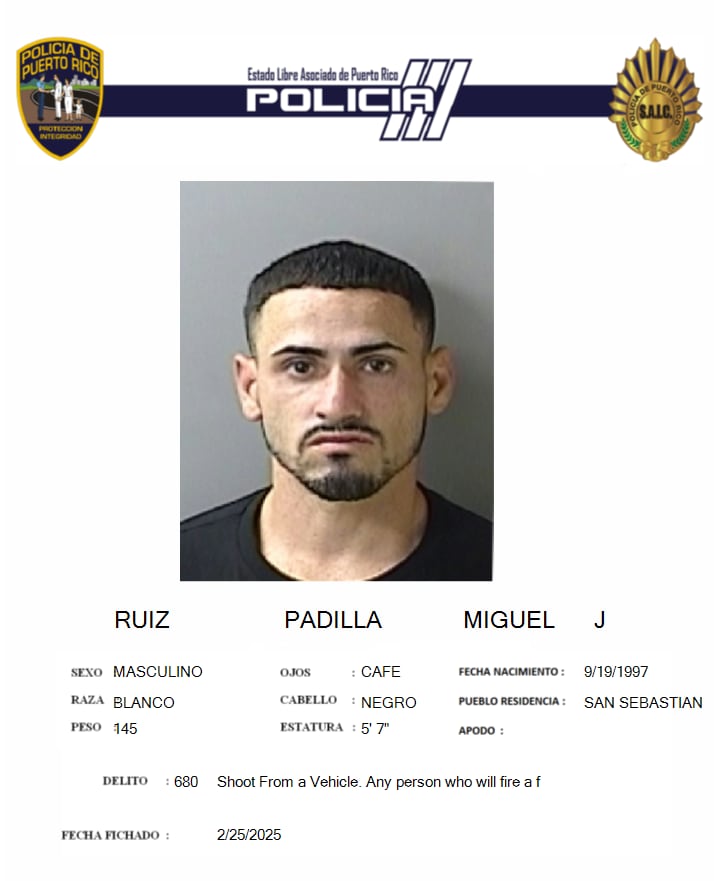 La Policía informó el viernes, 28 de febrero de 2025, que agentes de la Unidad Motorizada de Aguadilla, arrestaron a un hombre, identificado como Miguel J. Ruiz Padilla, de 27 años y residente de San Sebastián, por violentar la Ley de Armas luego de supuestamente disparar desde su vehículo en la carretera PR-449, sector Los Tanques, en el barrio Calabaza, de San Sebastián.