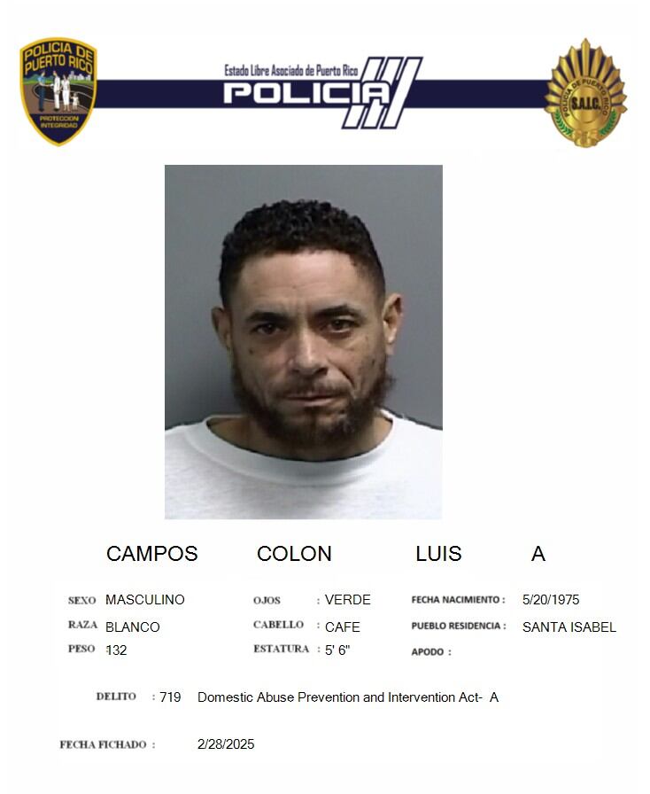 La Policía informó el viernes, 28 de febrero de 2025, sobre el arresto de Luis Antonio Campos Colón, de 46 años y residente de Santa Isabel, contra quien pesaba una orden de arresto con una fianza global de 2,500,000 dólares por tentativa de asesinato y violaciones a la Ley de Armas.