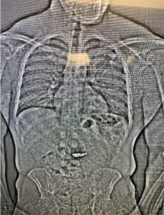 Una radiografía de su torso muestra lo que el Departamento de Policía de Orlando cree que son los aretes de diamantes: una masa blanca que brilla intensamente contra el fondo gris de su tracto digestivo.