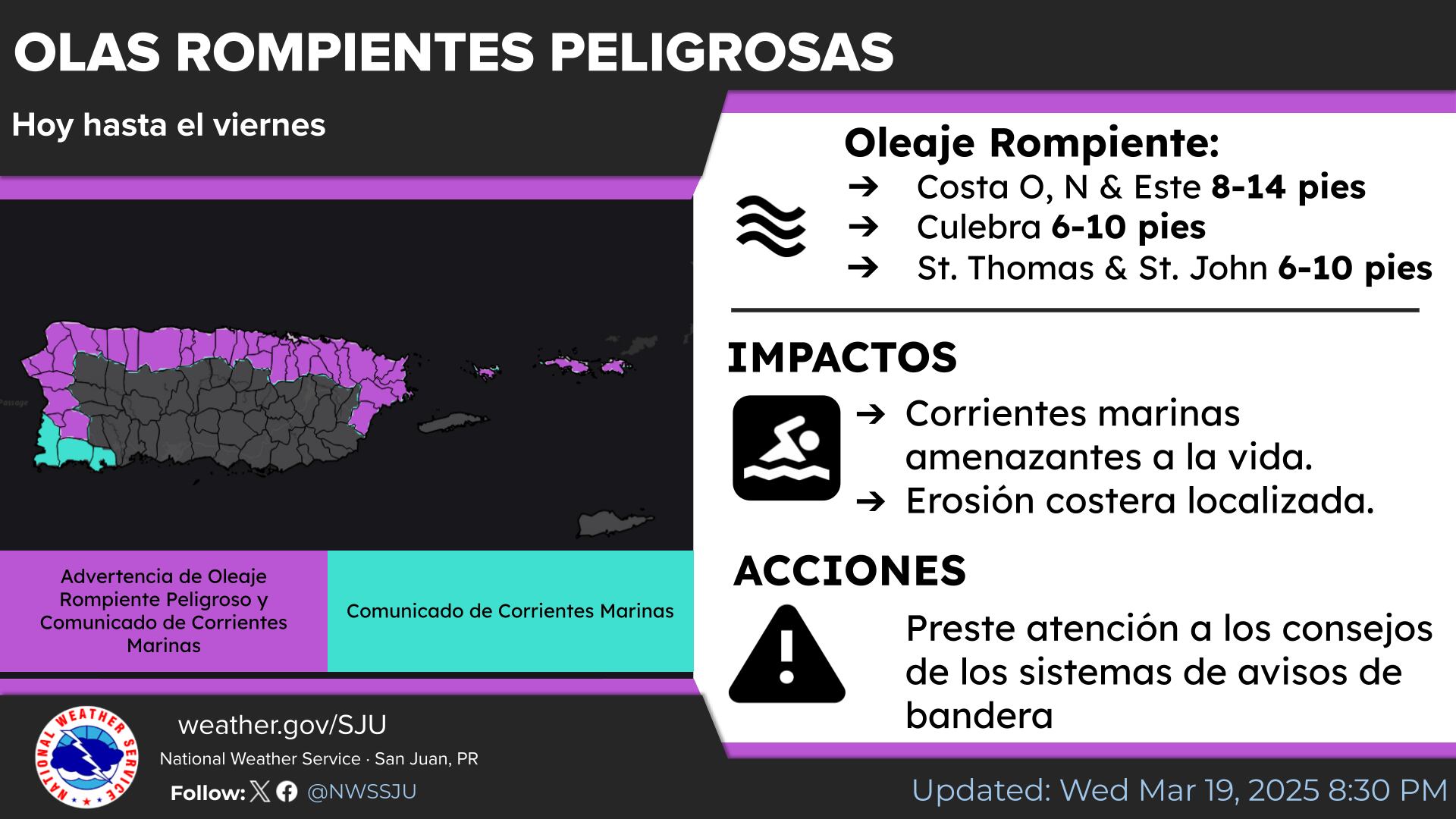 Estas condiciones marítimas peligrosas persistirán durante el fin de semana. Se exhorta al público a mantenerse atento e informado con las actualizaciones más recientes.