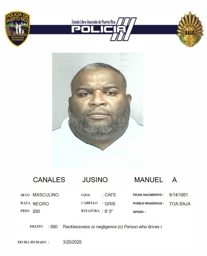 La Policía informó que el jueves, 19 de marzo de 2025, que presentaron un cargo criminal contra un hombre, identificado como: Manuel Canales Jusino, de 43 años y residente de Toa Baja, por violentar el artículo 5.07 (c) de la Ley de Vehículos y Tránsito de Puerto Rico, por imprudencia o negligencia al conducir.