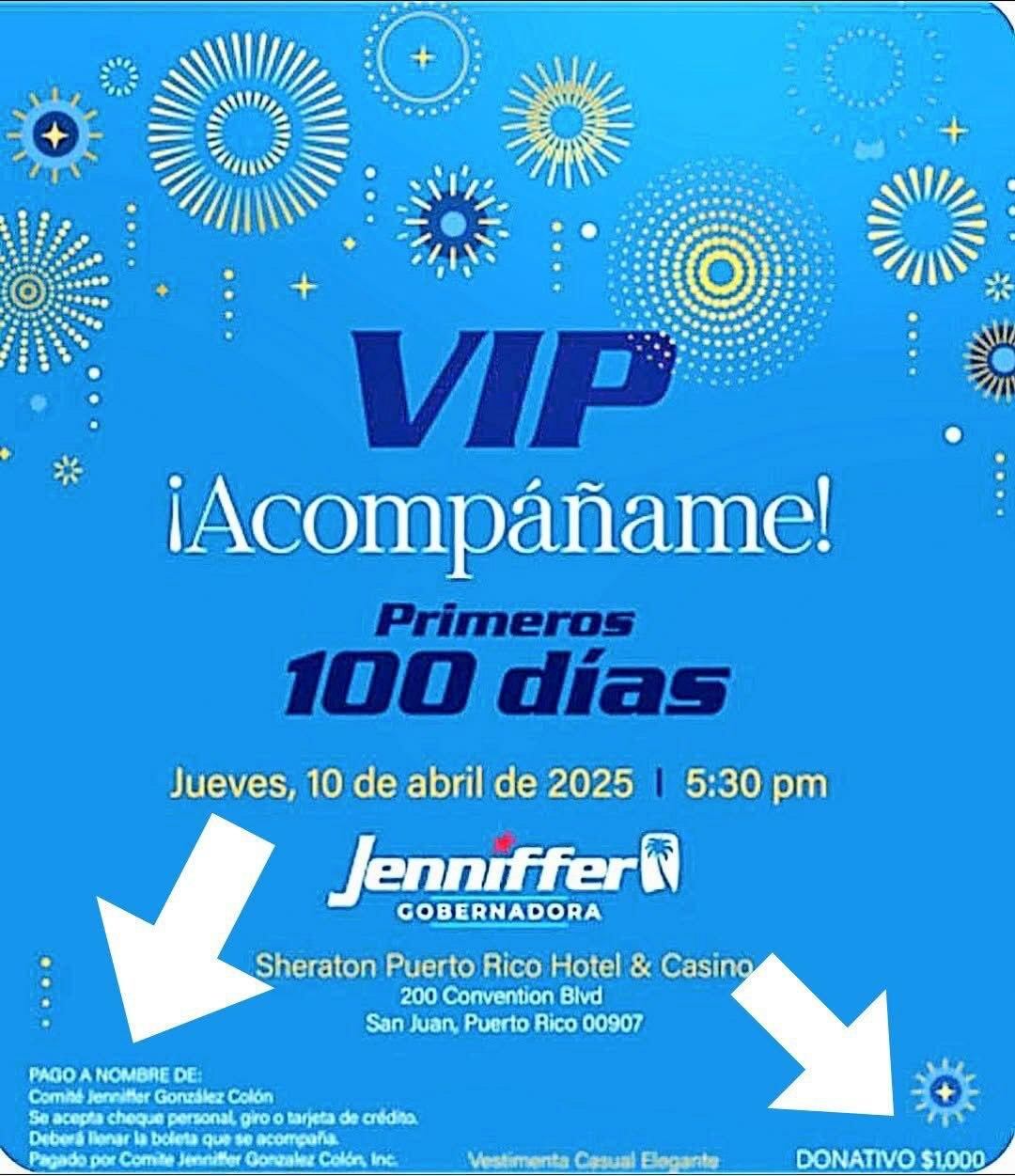 Para asistir, hay que donar mil dólares y el pago debe ser a nombre del Comité Jenniffer González Colón.