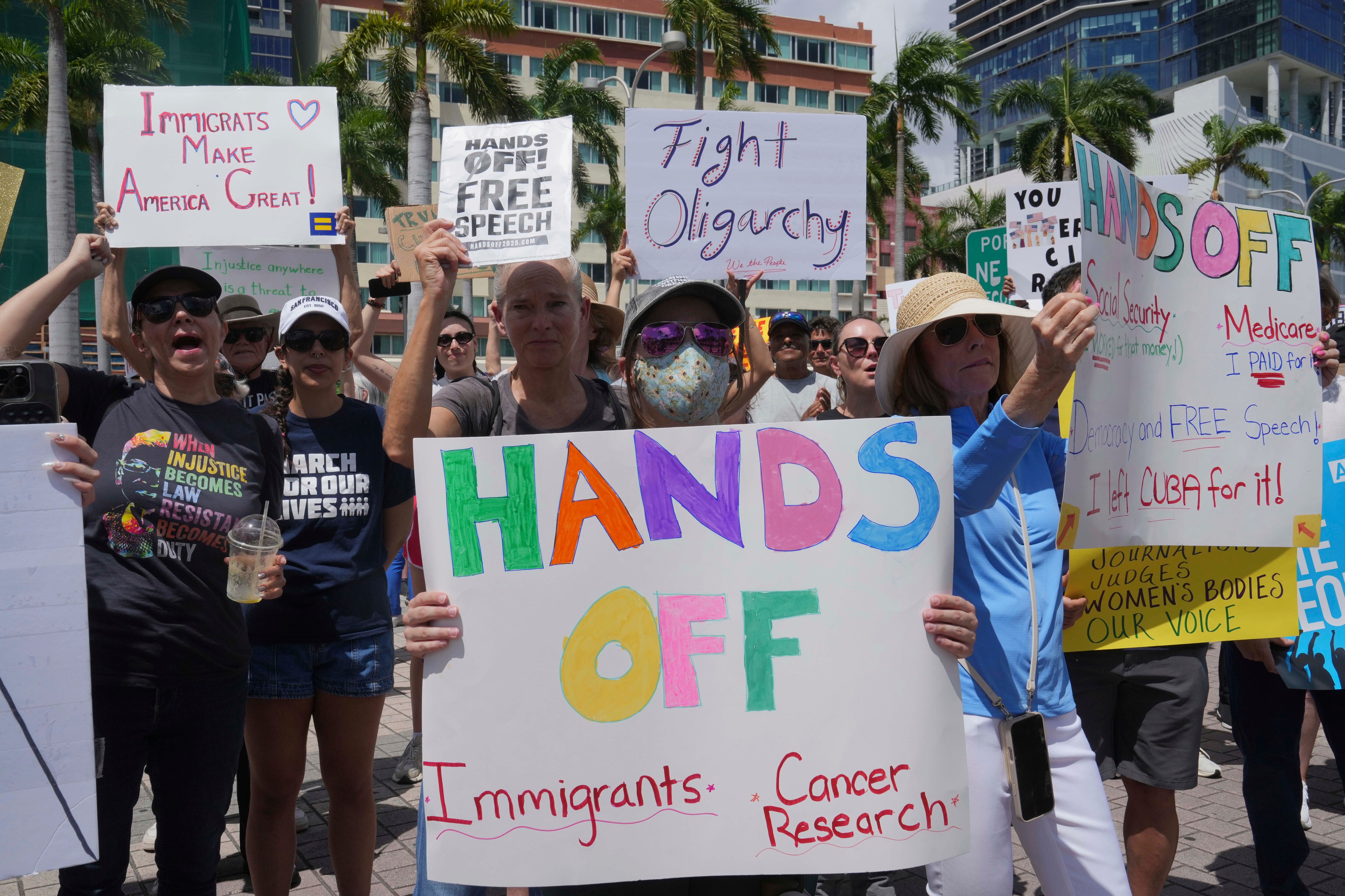 Los manifestantes critican las medidas del gobierno de Trump para despedir a miles de trabajadores federales, cerrar oficinas de campo de la Administración del Seguro Social, eliminar agencias enteras, deportar inmigrantes, reducir las protecciones para las personas transgénero y recortar la financiación federal para programas de salud.