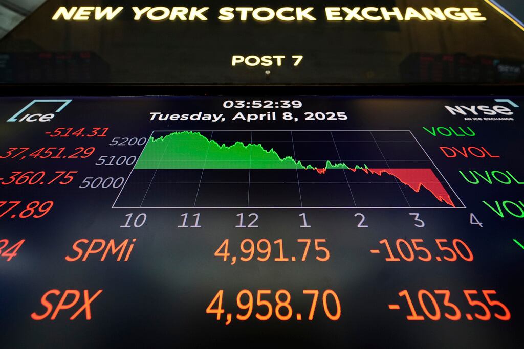 Después de dispararse 4.1% por la mañana, que habría marcado su mejor día en años, el S&P 500 rápidamente perdió todo. Luego se desplomó hasta 3% antes de reducir su caída al 1.6%. Al cierre perdió 79.48 puntos para quedar en 4,982.77. Eso dejó al índice, que se encuentra en el corazón de muchas cuentas de jubilación 401(k), casi un 19% por debajo de su récord establecido en febrero.
