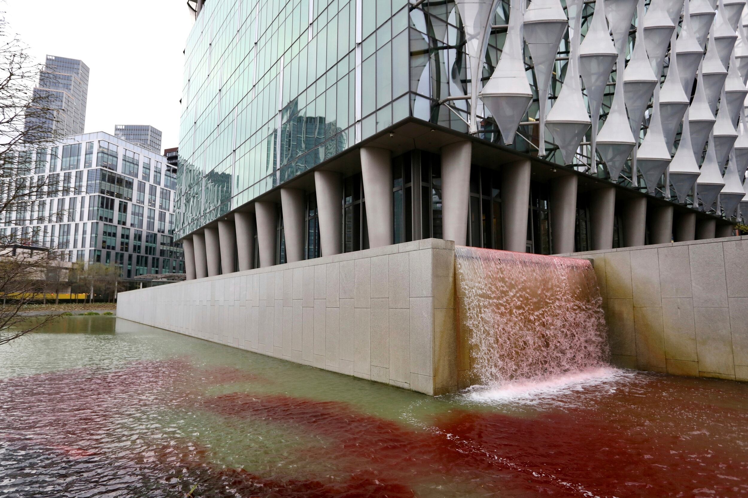 Greenpeace Reino Unido declaró que 12 de sus activistas vertieron “tinte no tóxico y biodegradable de contenedores con las palabras Stop Arming Israel” en el estanque.
