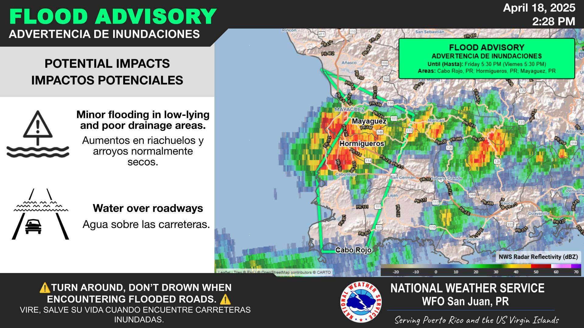 Según el boletín meteorológico, el radar Doppler detectó intensas lluvias asociadas a tormentas eléctricas que ya han dejado acumulaciones de entre una y dos pulgadas de precipitación en la región. Las autoridades advierten que las lluvias continuarán durante el resto de la tarde, lo que podría provocar inundaciones menores en áreas bajas, con mal drenaje y en carreteras.