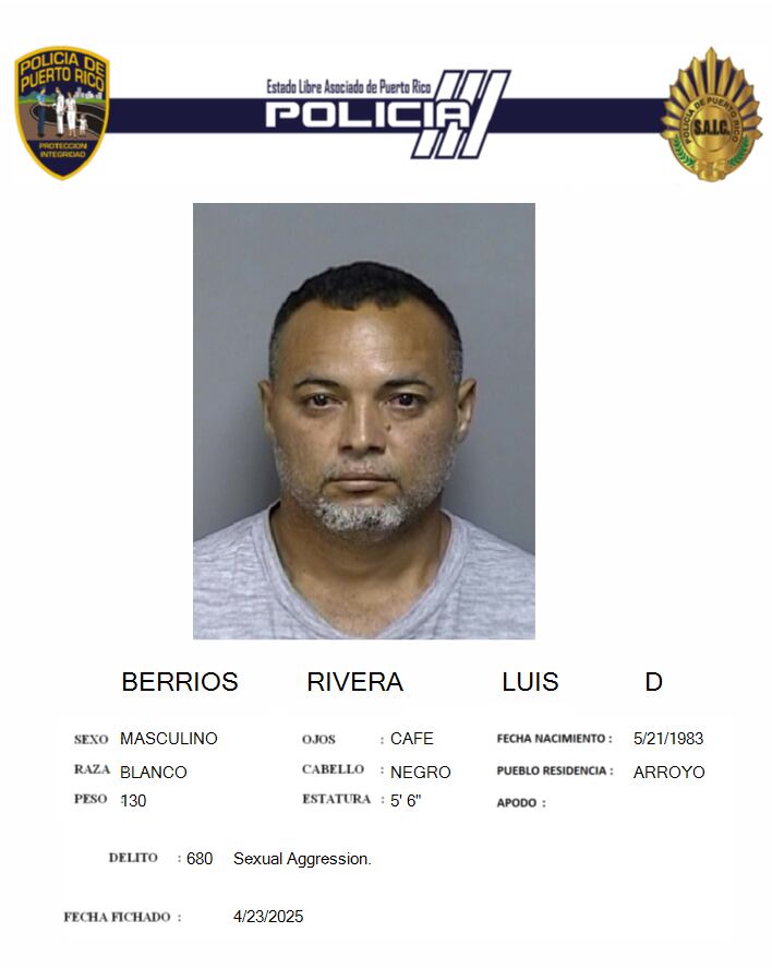 Agentes del Negociado de la Policía de Puerto Rico (NPPR), adscritos a la División de Delitos Sexuales y Maltrato de Menores área de Guayama, llevaron a cabo una investigación que culminó en la tarde de ayer, miércoles, con la radicación de cargos por parte de la Fiscalía contra Luis Daniel Berrios Rivera, de 42 años y residente de Arroyo, por alegadamente agredir sexualmente a una niña de 5 años.