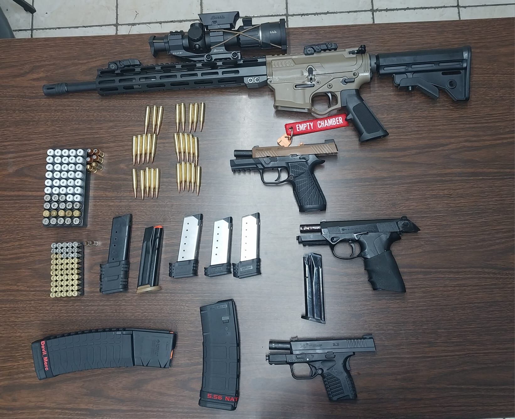 Durante la intervención, la Policía ocupó una pistola Sig Sauer M18 calibre 9 milímetros, una Beretta PX4 Storm calibre .45, una Springfield XDS calibre .45, un rifle American Tactical calibre 5.56, además de 28 municiones de rifle, 56 municiones calibre .45, 52 municiones calibre 9 milímetros, dos cargadores de rifle y seis cargadores de pistola.