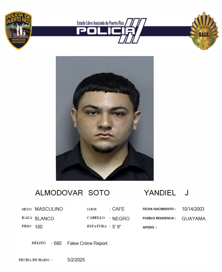 Las autoridades radicaron cargos criminales por alegación falsa contra Yandiel Joel Almodóvar Soto, de 21 años y residente de Guayama, quien aseguró que una persona le disparó desde un vehículo en marcha mientras alimentaba a un equino en su propiedad.