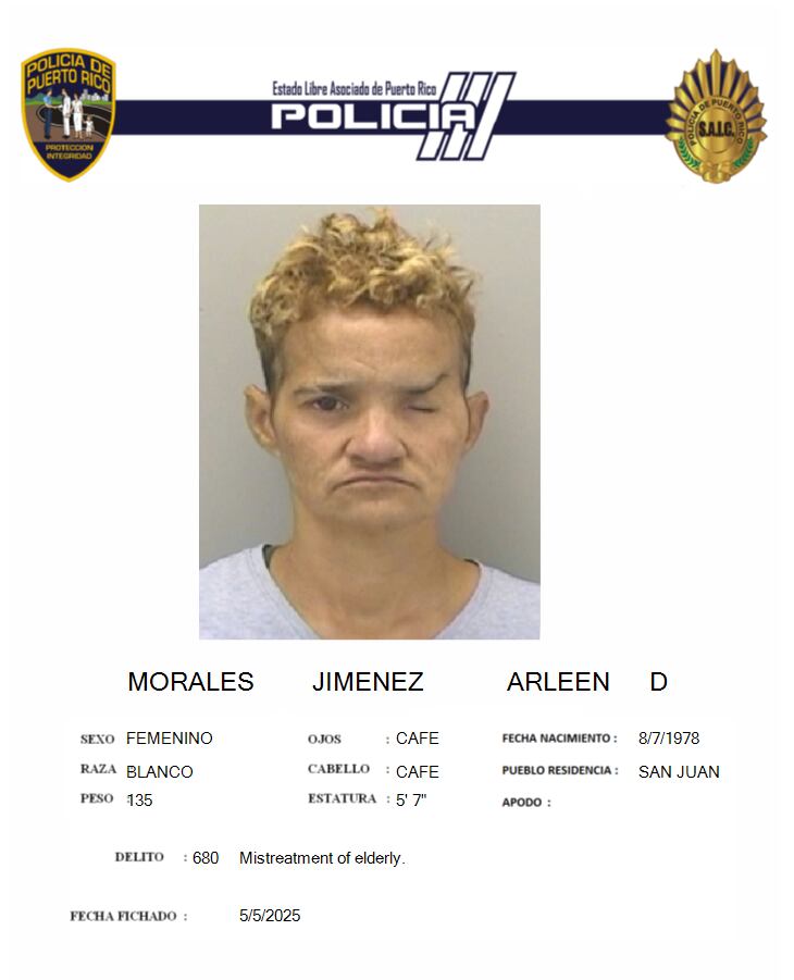 Agentes del Negociado de la Policía de Puerto Rico, adscritos al Precinto de Monte Hatillo, realizaron una investigación que culminó en la radicación de cargos por parte de la Fiscalía, por maltrato a persona de edad avanzada contra Arleen D. Morales Jiménez, de 46 años y vecina de San Juan.