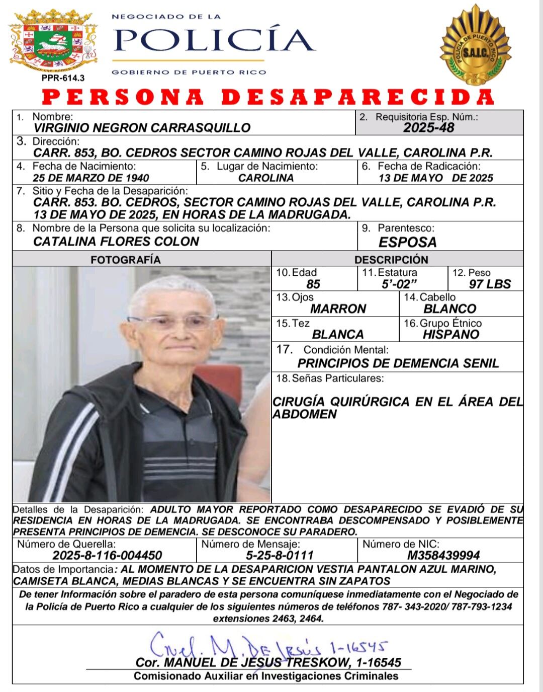 El hombre, de 85 años, había sido reportado como desaparecido durante el día de ayer, por su esposa Catalina Flores Colón, tras este salir de su residencia localizada en Carolina.