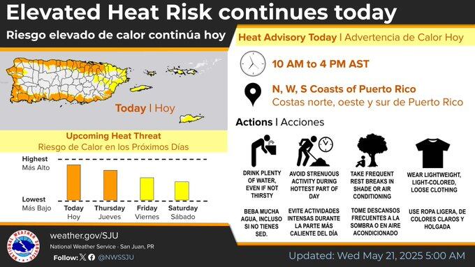 [MAY 21]🥵 Advertencia de calor en efecto norte/oeste/sur de PR [10 AM a 4 PM] Para el resto del área: 🌡️ Índices de 102°-107° son posibles.