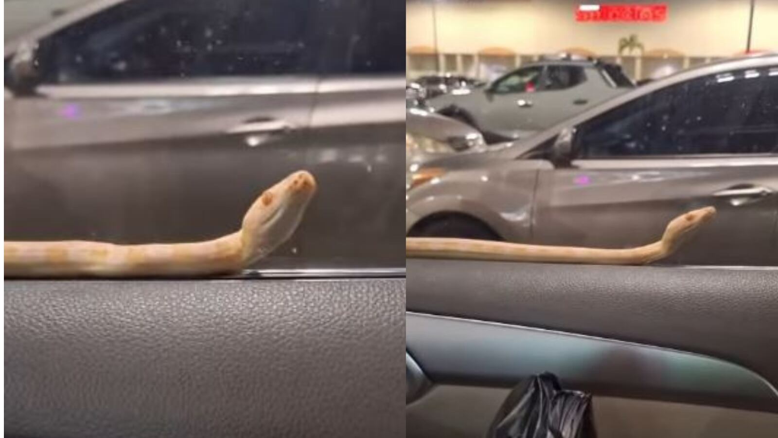 Una ciudadana pasó un enorme susto cuando encontró una pitón reticulada albina en la ventana de su carro en Caguas.