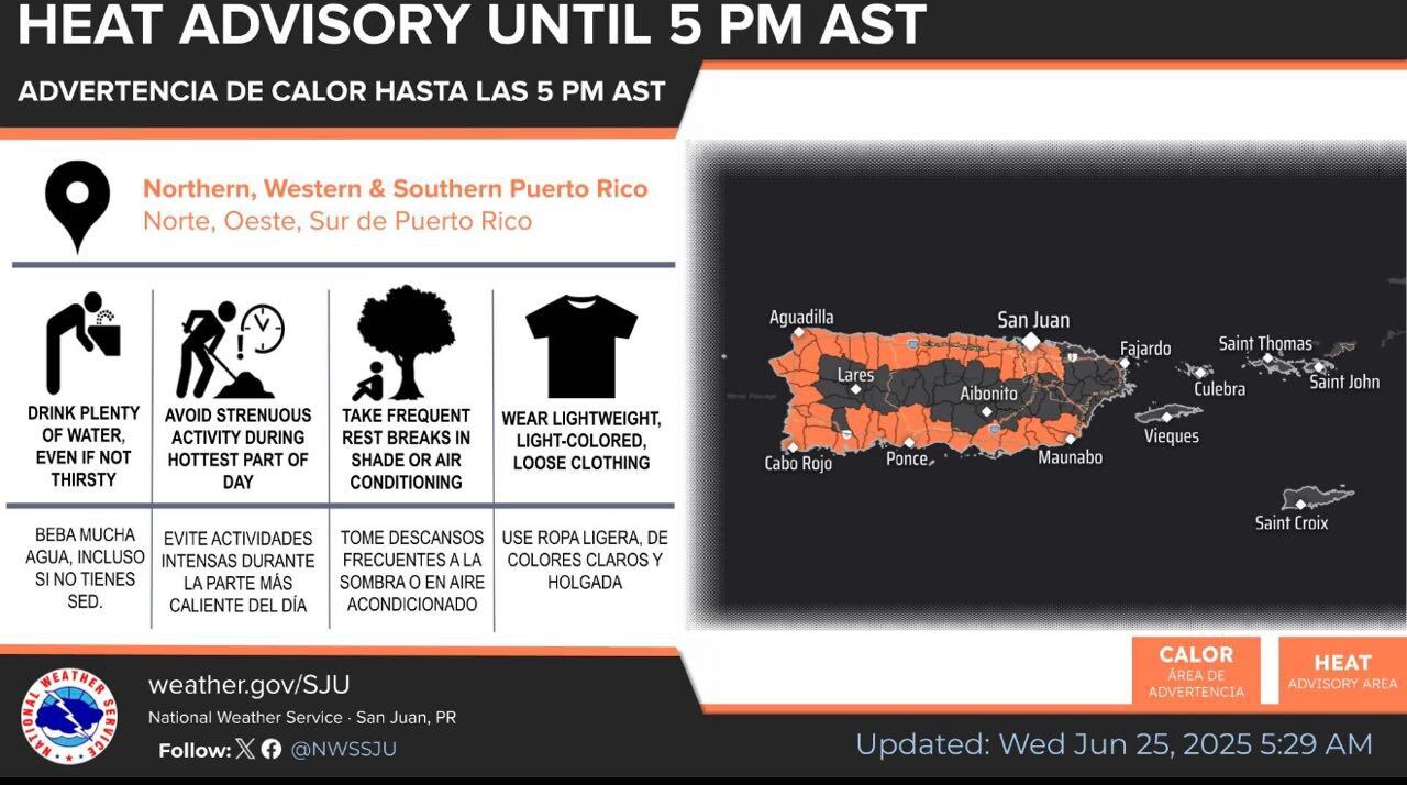Las autoridades del tiempo emitieron una advertencia de calor desde las 9:00 de la mañana hasta las 5:00 de la tarde y una alerta especial por condiciones de incendios vigentes para el miércoles, 25 de junio de 2025.