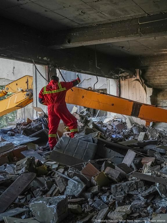 Hombres trabajan removiendo escombros tras el ataque contra la prisión de Evin. DW