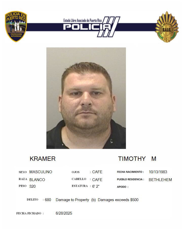 El Negociado de la Policía de Puerto Rico informó que se radicaron cargos por daños agravados contra Timothy M. Kramer, de 41 años y residente de Bethlehem, tras un incidente ocurrido en la madrugada del 28 de junio de 2025 en el Viejo San Juan.