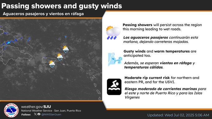 Jul 2: Passing showers and gusty winds will persist this morning, leaving wet roads. | Aguaceros pasajeros y vientos en ráfaga continuarán esta mañana, dejando pavimento mojado. #prwx #usviwx pic.twitter.com/pfwAWfIq1F