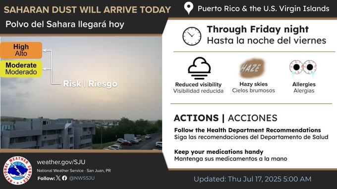 La humedad remanente de la onda traerá más lluvias durante la mañana, antes de que una capa de aire con polvo del Sahara, con concentraciones moderadas a altas, llegue esta mañana y se mantenga hasta el viernes. Aunque el polvo causará cielos brumosos, la humedad traerá lluvias leves en las zonas expuestas al viento durante el día. Por la tarde, el calor del día, efectos locales y la brisa marina provocarán lluvias en áreas al este de las Islas Vírgenes y la Sierra de Luquillo, así como en el interior y oeste de Puerto Rico. Esto puede causar encharcamientos en calles y zonas con mal drenaje, y posibles inundaciones urbanas y en pequeños arroyos. Se podrían formar una o dos tormentas fuertes en la tarde, reforzadas por las partículas de polvo en el aire.