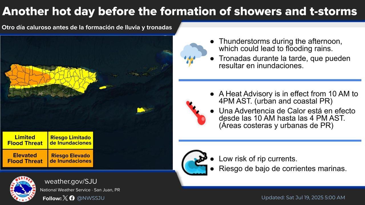 Para domingo y lunes se espera el patrón veraniego típico con chubascos en el este de Puerto Rico y las Islas Vírgenes, y lluvias con tronadas mayormente en el noroeste. Aunque la precipitación será localizada, no se descartan inundaciones urbanas menores.