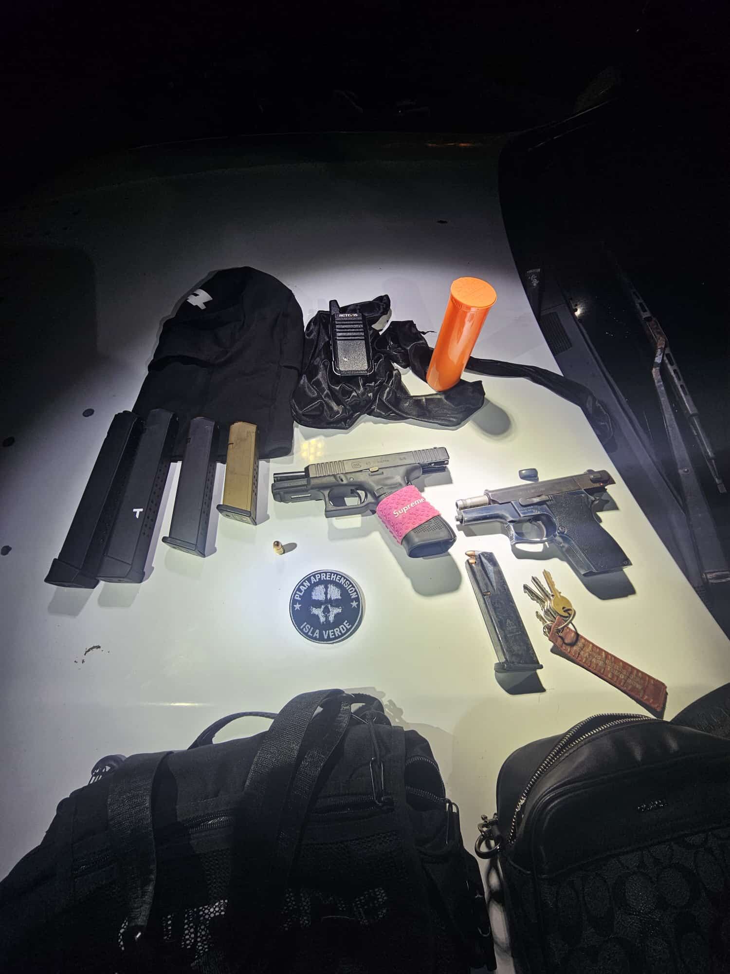 A eso de la 1:00 a.m, de hoy, sábado, la agente Adalia Figueroa Rodríguez intervino por tintes indebidos de la Ley 22 con un vehículo Toyota Camry en la Avenida Isla Verde, frente al Burger King, donde iban cuatro hombres. En la intervención se ocuparon dos (2) armas de fuego, una de ellas alterada para ser disparada de manera automática, cargadores, municiones y marihuana mezclada con fentanilo.
