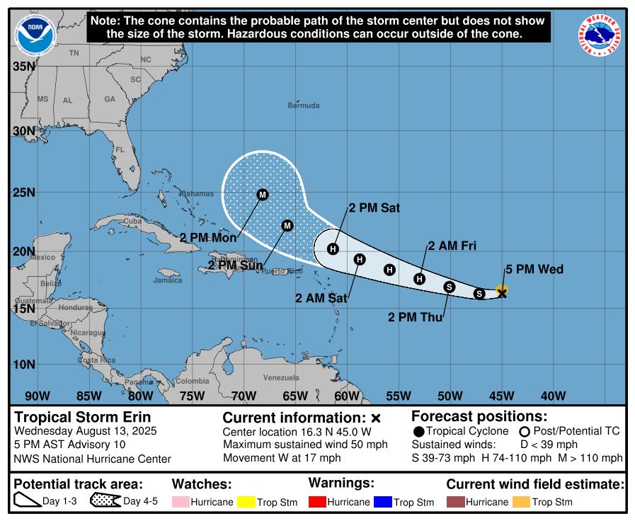 Los vientos con fuerza de tormenta tropical se extienden hasta 60 millas (95 kilómetros) del centro. El CNH advirtió que oleaje generado por Erin comenzará a afectar el fin de semana a las Islas de Sotavento del norte, las Islas Vírgenes y Puerto Rico, con riesgo de corrientes marinas peligrosas y resacas que amenazan la vida.