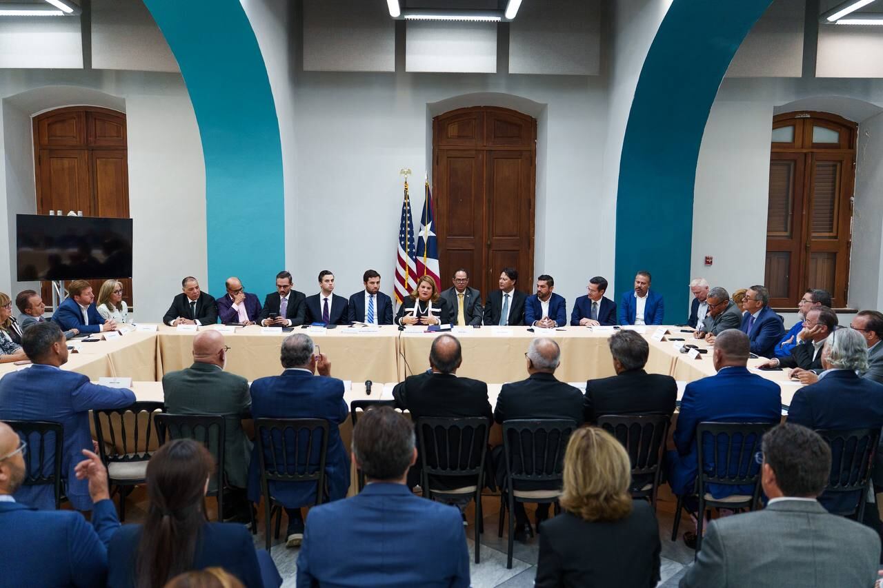 La gobernadora Jenniffer González Colón, junto al secretario del Departamento de Desarrollo Económico y Comercio (DDEC), Sebastián Negrón Reichard, sostuvo el jueves en La Fortaleza un encuentro con más de 30 directivos de empresas del sector manufacturero con el fin de delinear estrategias que fortalezcan la competitividad global de Puerto Rico.