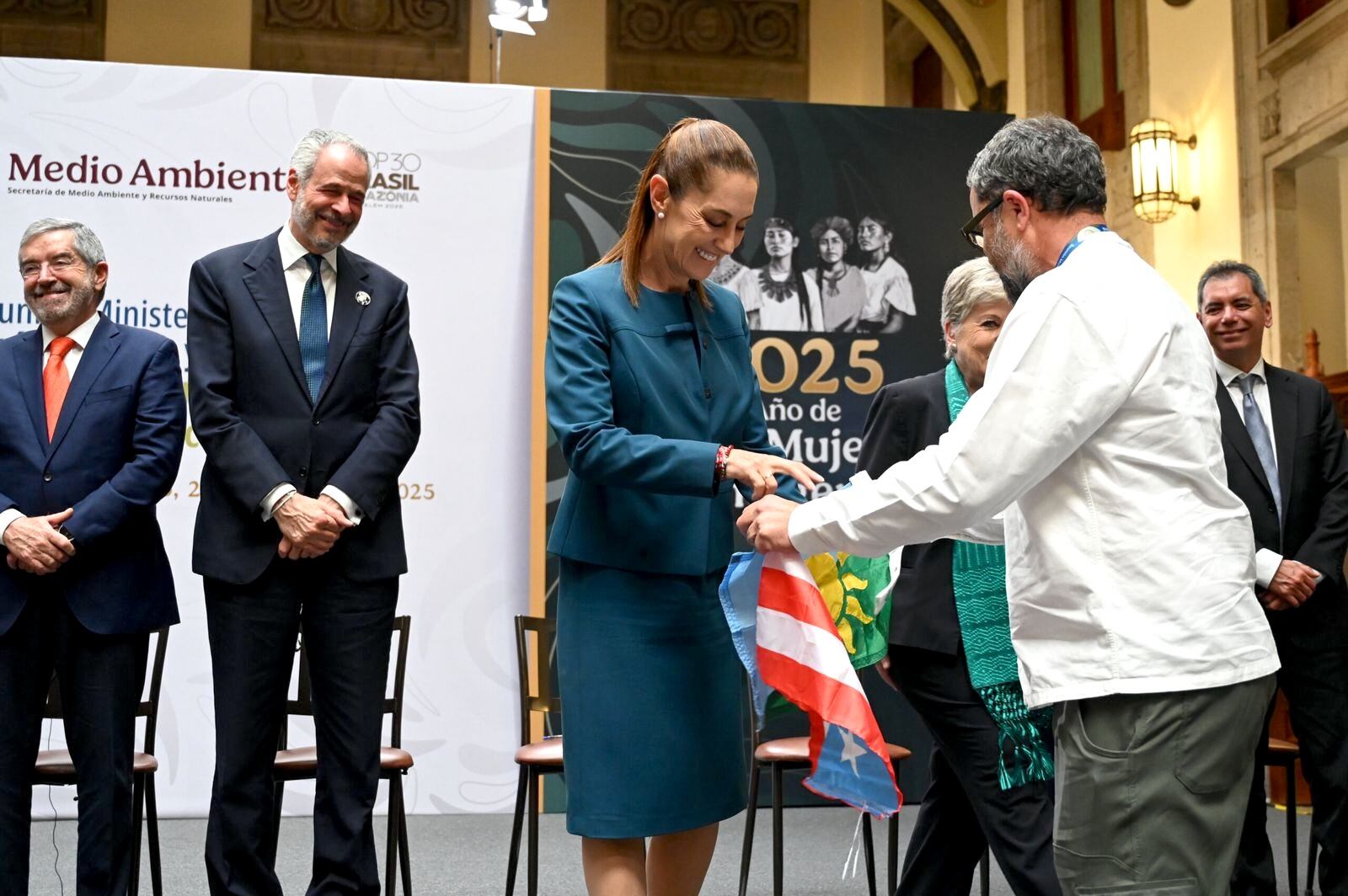 Como parte del evento, el profesor Massol Deyá entregó a la presidenta de México, Claudia Sheinbaum, la bandera de la “insurrección energética” que surgió en Adjuntas como símbolo de la lucha comunitaria por un modelo energético justo y sostenible.