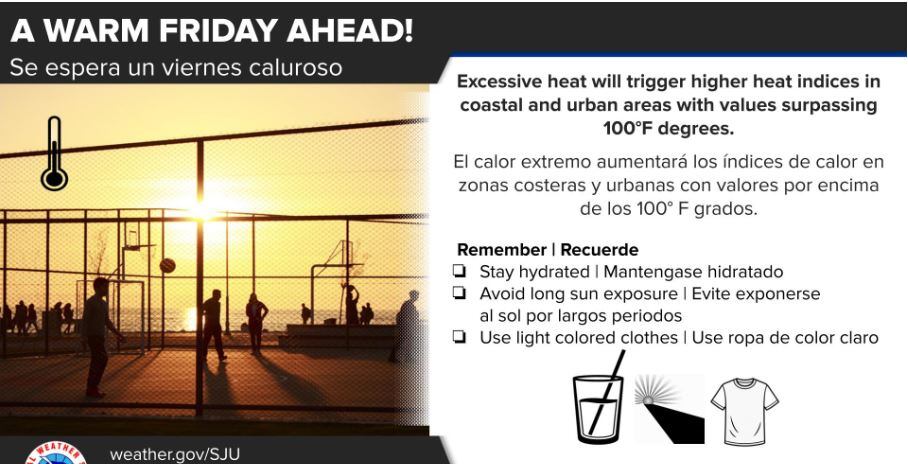 Hoy se encuentra en efecto un aviso de calor extremo entre las 10:00 a.m. y las 5:00 p.m. para las zonas urbanas y costeras de Puerto Rico. Para Vieques, Culebra y las Islas Vírgenes, está vigente una Advertencia de Calor en el mismo horario. Además, se mantiene un bajo riesgo de corrientes marinas para hoy y durante el fin de semana festivo en todas las playas de Puerto Rico y las Islas Vírgenes.