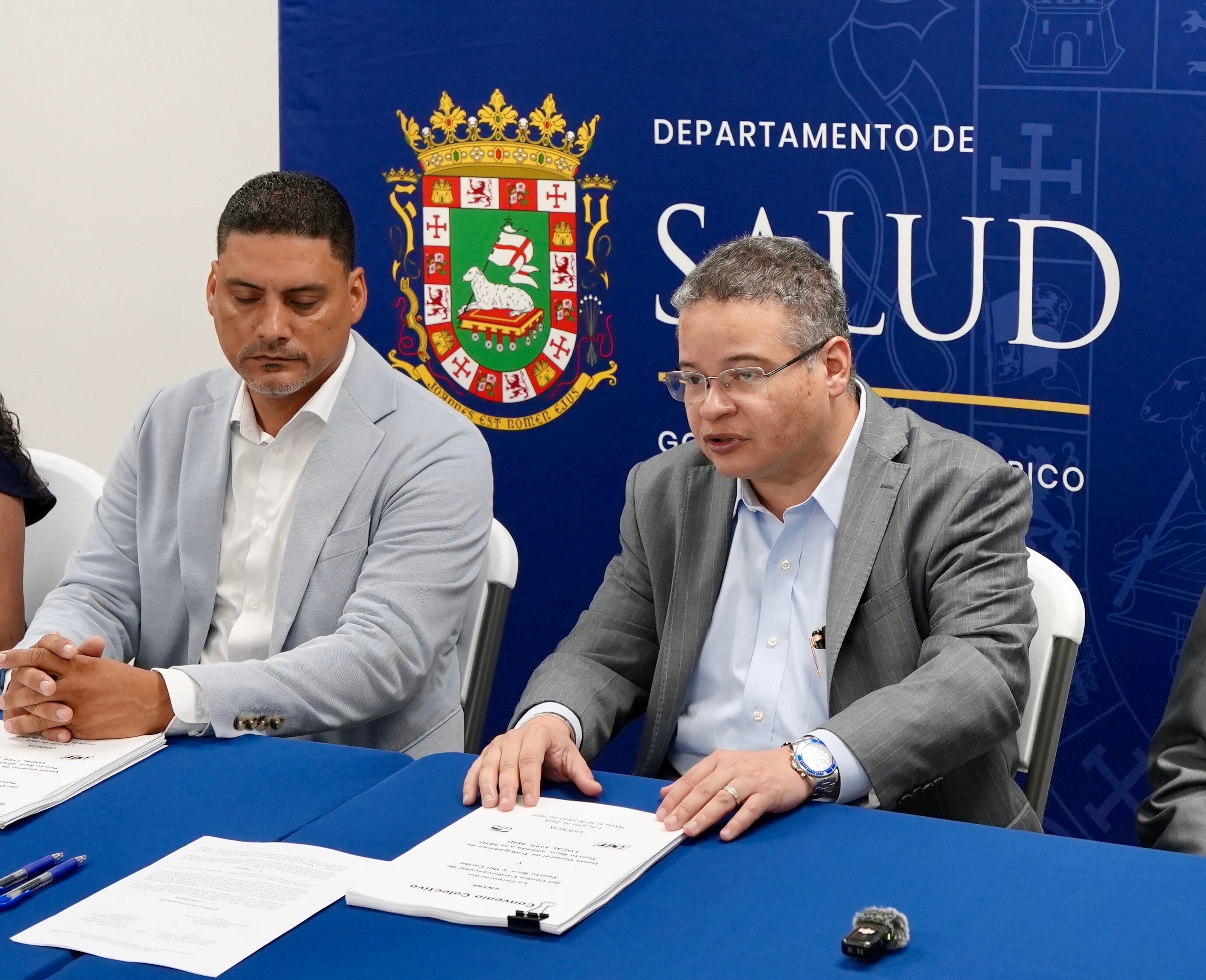El presidente de la Unión General de Trabajadores (UGT), Edwin Méndez Cardona, y el secretario del Departamento de Salud (DS), Víctor Ramos Otero, firmaron hoy el convenio colectivo con el Centro Cardiovascular de Puerto Rico y del Caribe, que llevaba años en negociación.
