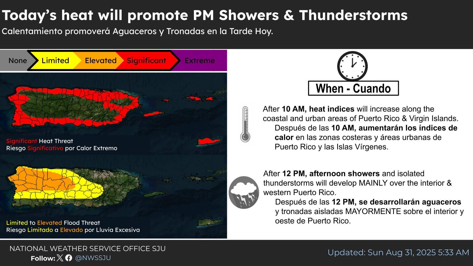 El Servicio Nacional de Meteorología (SNM) en San Juan informó sobre condiciones inestables ante un aviso de calor extremo y tronadas fuertes tras el remanente del paso de una onda tropical al sur de Puerto Rico para este domingo.