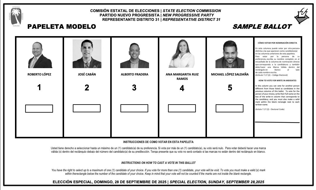 El primer turno en la papeleta será para Roberto López, seguido por José Cabán en la segunda posición, Alberto Fradera en la tercera, Ana María Margarita Ruíz Ramos en la cuarta y Michael López Saldaña en la quinta.