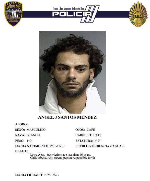 De acuerdo al reporte policial, los agentes, adscritos a la División de Delitos Sexuales y Maltrato a Menores, en unión a la fiscalía de Caguas presentaron cargos contra un hombre, identificado como Angel Javier Santos Méndez, de 33 años, por alegadamente cometer actos lascivos a una menor, de 2 años.
