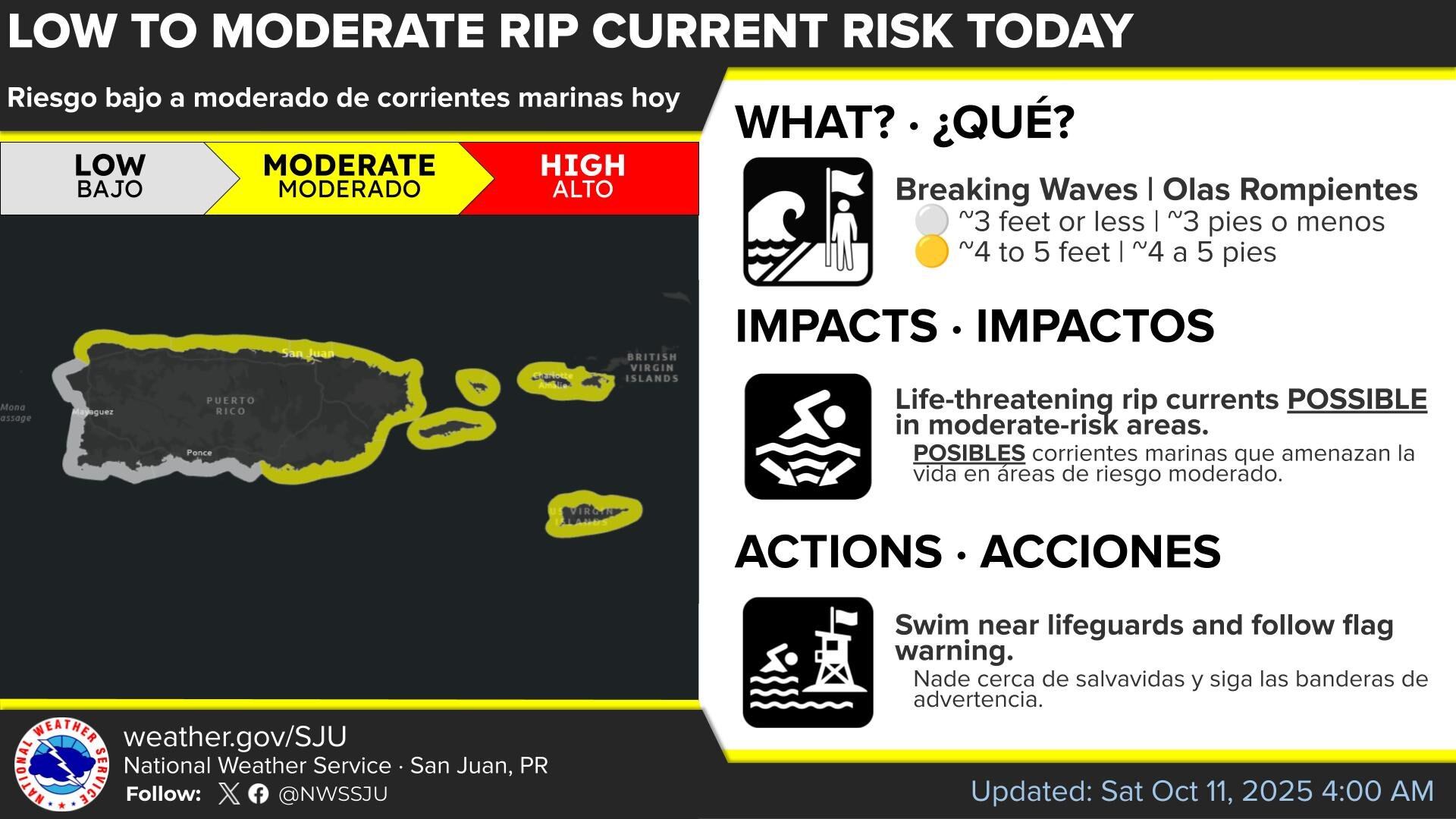 Las condiciones marítimas continúan peligrosas, aunque comienzan a mejorar gradualmente. Se mantiene en vigor una advertencia para embarcaciones pequeñas hasta el mediodía de hoy para las aguas del Atlántico y el Pasaje de Anegada, donde el oleaje puede alcanzar hasta siete pies.