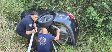 Rescatan a conductora y menor tras accidente con auto volcado en Toa Alta