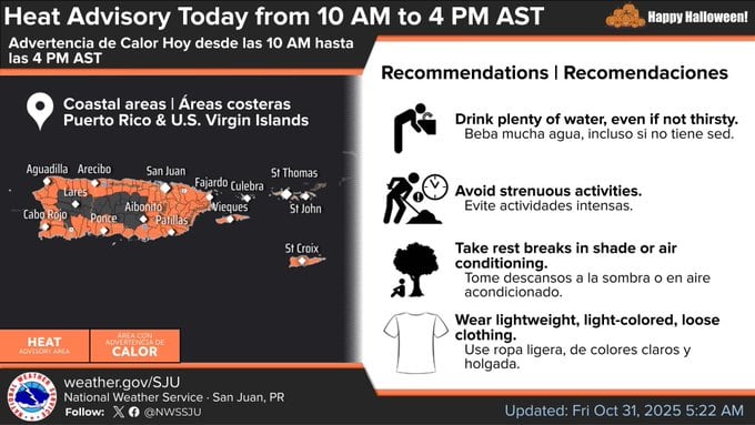 El Servicio Nacional de Meteorología informó este viernes, 31 de octubre de 2025, que se mantiene una advertencia de calor desde las 10:00 de la mañana hasta las 4:00 de la tarde.