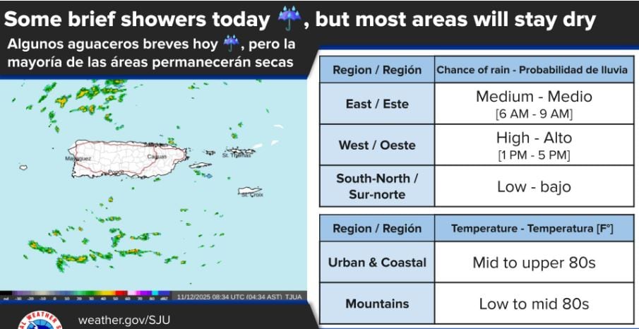 Para el viernes, el sistema de alta presión que mantiene el tiempo estable perderá fuerza, y eso hará que los vientos bajen de intensidad. Con el aire más caliente subiendo, podrían formarse algunos aguaceros o tronadas en el centro de la isla, pero no se espera nada fuerte ni riesgo de inundaciones.