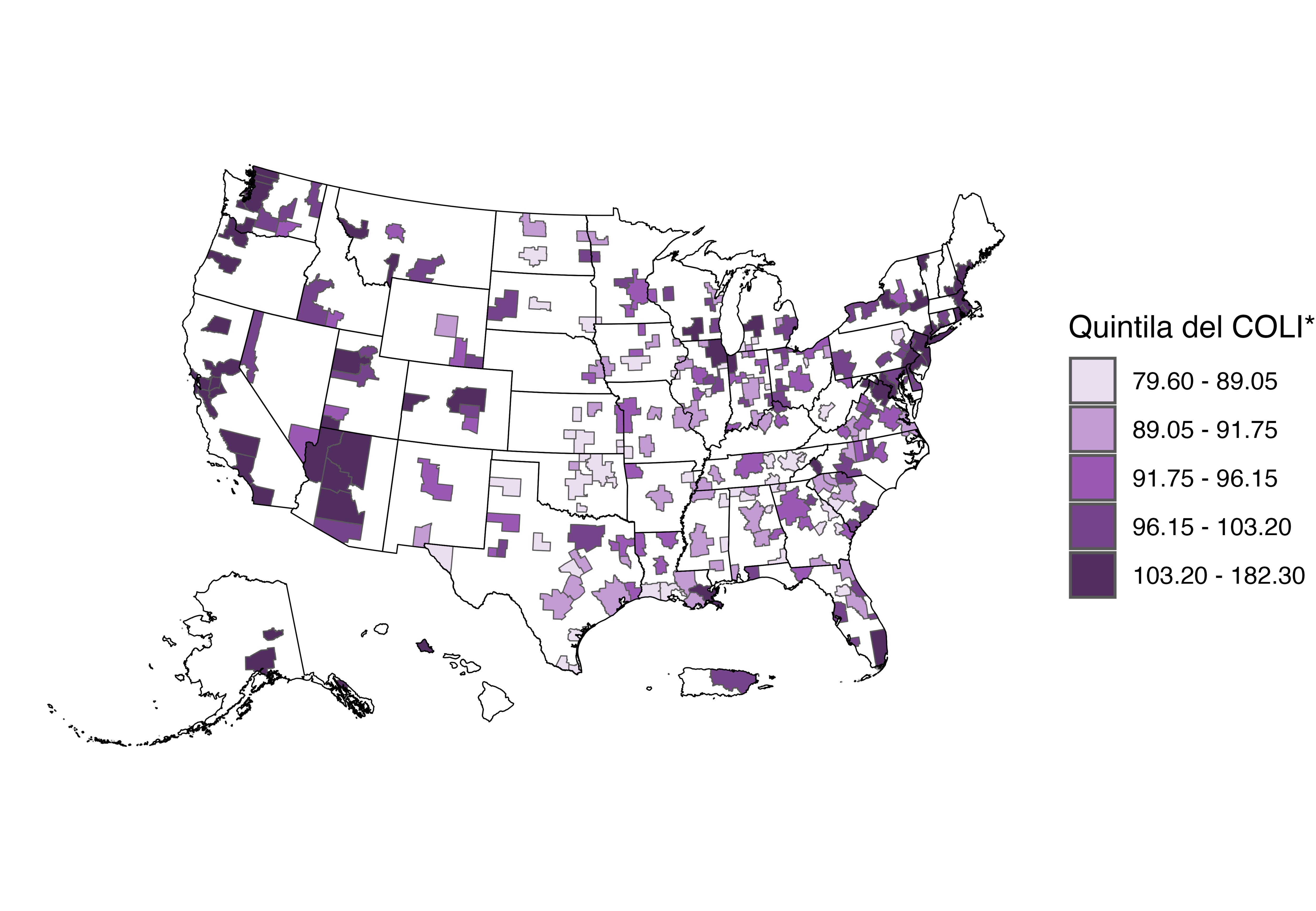 El estudio combina información del Índice de Costo de Vida (COLI, por sus siglas en inglés) con los datos demográficos más recientes del U.S. Census Bureau, lo que permite –por primera vez– comparar directamente el costo de vida de las 290 áreas urbanas participantes y la distribución de personas puertorriqueñas en ellas.
