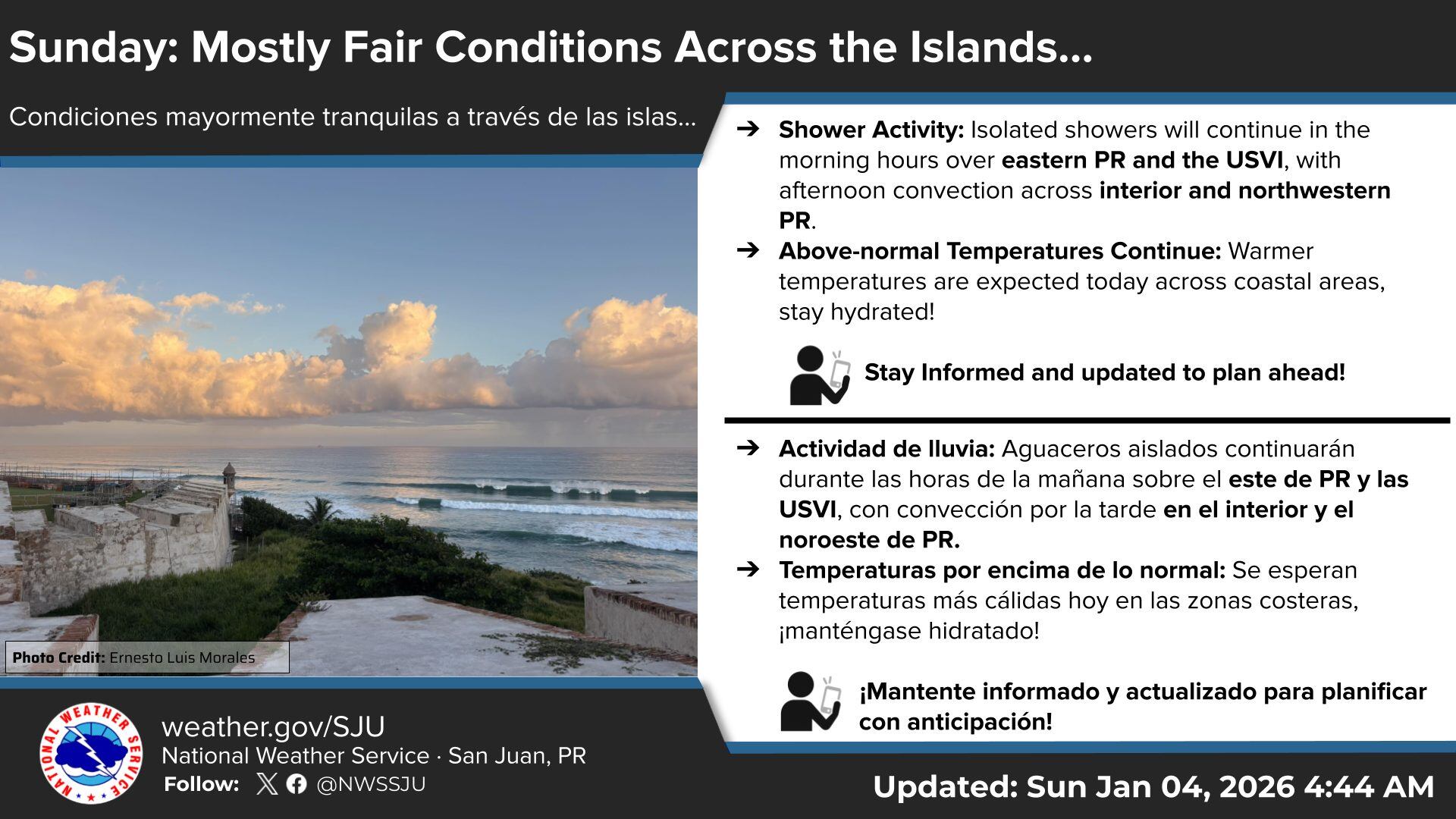 El Servicio Nacional de Meteorología (NWS, por sus siglas en inglés) en San Juan informó que las condiciones del tiempo este domingo permanecerán estables, con aguaceros aislados y temperaturas más cálidas en la zona costera.
