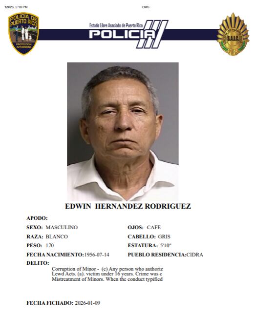 La Fiscalía radicó cargos criminales contra Edwin Hernández Rodríguez, de 69 años y residente de Cidra, por seducción de menores, actos lascivos, maltrato de menores y tentativa de destrucción de prueba, tras una investigación realizada por la División de Delitos Sexuales y Maltrato de Menores del Cuerpo de Investigaciones Criminales (CIC) de Caguas.