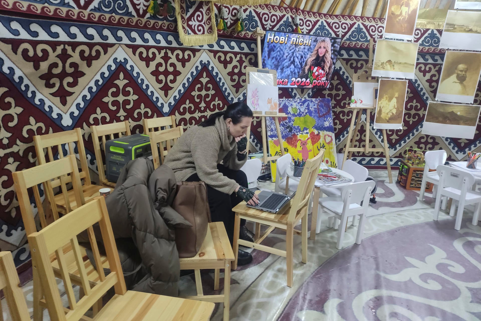 Bajo el techo abombado y las paredes de tela con cenefas orientales de la yurta muchos ucranianos encuentran algo de calor y la electricidad que necesitan para trabajar en sus ordenadores durante los apagones.