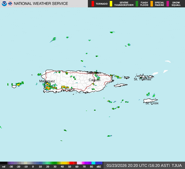 La humedad asociada a una vaguada en superficie continuará sobre la región hasta el domingo en la mañana, manteniendo un patrón de aguaceros pasajeros y cielos variables. Durante el día de hoy, las lluvias afectarán principalmente el este de Puerto Rico, mientras que en la tarde se formarán bandas de lluvia (“streamers”) al oeste de las Islas Vírgenes, de El Yunque y a lo largo de la Cordillera Central.