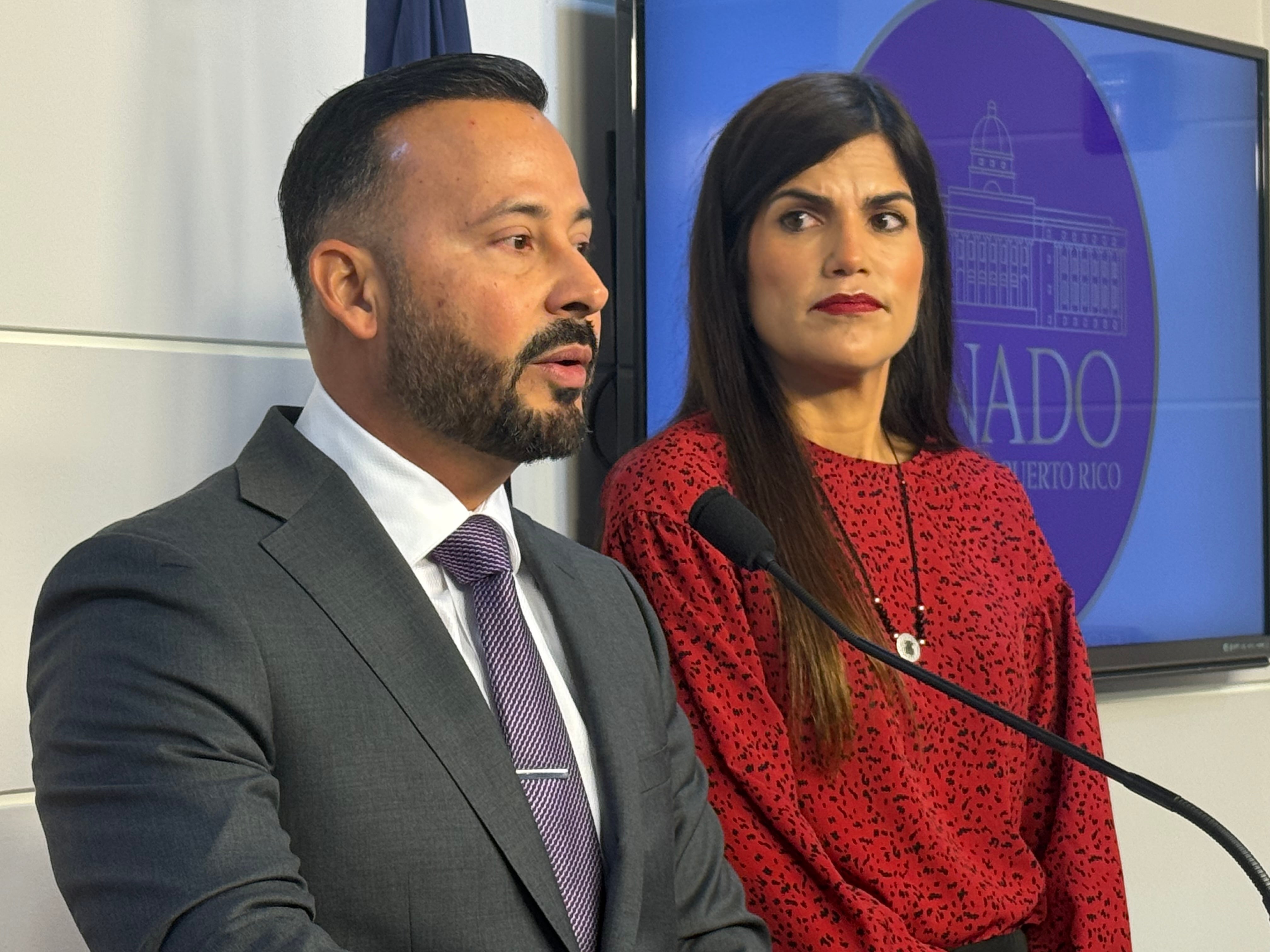 Senado PPD Los senadores del PPD Luis Javier Hernández y Marially González Huertas durante una conferencia de prensa en el Capitolio, donde plantearon que existen ahorros presupuestarios para mantener la exención del IVU a los sistemas de energía solar. (Suministrada)