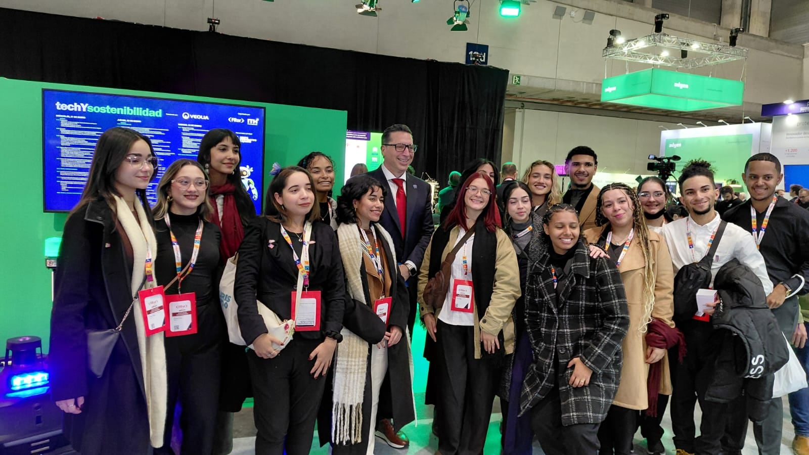 FITUR Estudiantes del programa de turismo de la Universidad de Puerto Rico en Carolina conversan con Jorge Pérez, principal oficial ejecutivo de Discover Puerto Rico, durante su participación en la Feria Internacional de Turismo (FITUR) 2026 en Madrid, España. (Suministrada)