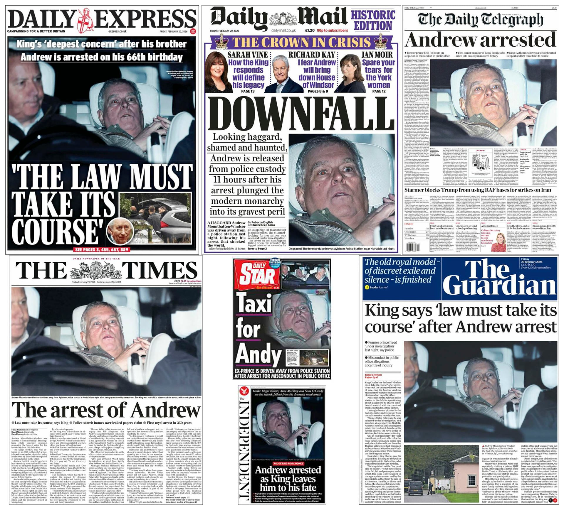 Los periódicos británicos llevan este viernes es sus portadas una fotografía de Andrés Mountbatten-Windsor tras pasar gran parte de la jornada de ayer en comisaria, donde fue interrogado por supuesta mala conducta en un cargo público como un sospechoso más, pese a ser el hermano del rey Carlos III.