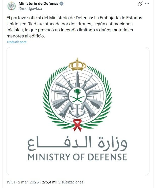 El Ministerio de Defensa de Arabia Saudí confirmó este lunes que la embajada de Estados Unidos en Riad fue atacada por dos drones, lo que ocasionó “pequeño incendio y daños materiales menores en el edificio”, sin que se informara de víctimas.