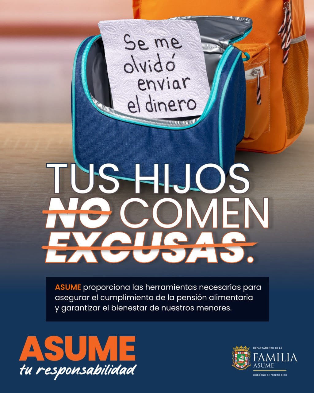 La Administración para el Sustento de Menores (ASUME), adscrita al Departamento de la Familia, promueve la importancia de cumplir con la obligación alimentaria, reforzando la responsabilidad de las partes no custodias en el bienestar de sus hijos con Tus hijos no comen excusas, una iniciativa que comenzó hoy y está dirigida a crear conciencia.