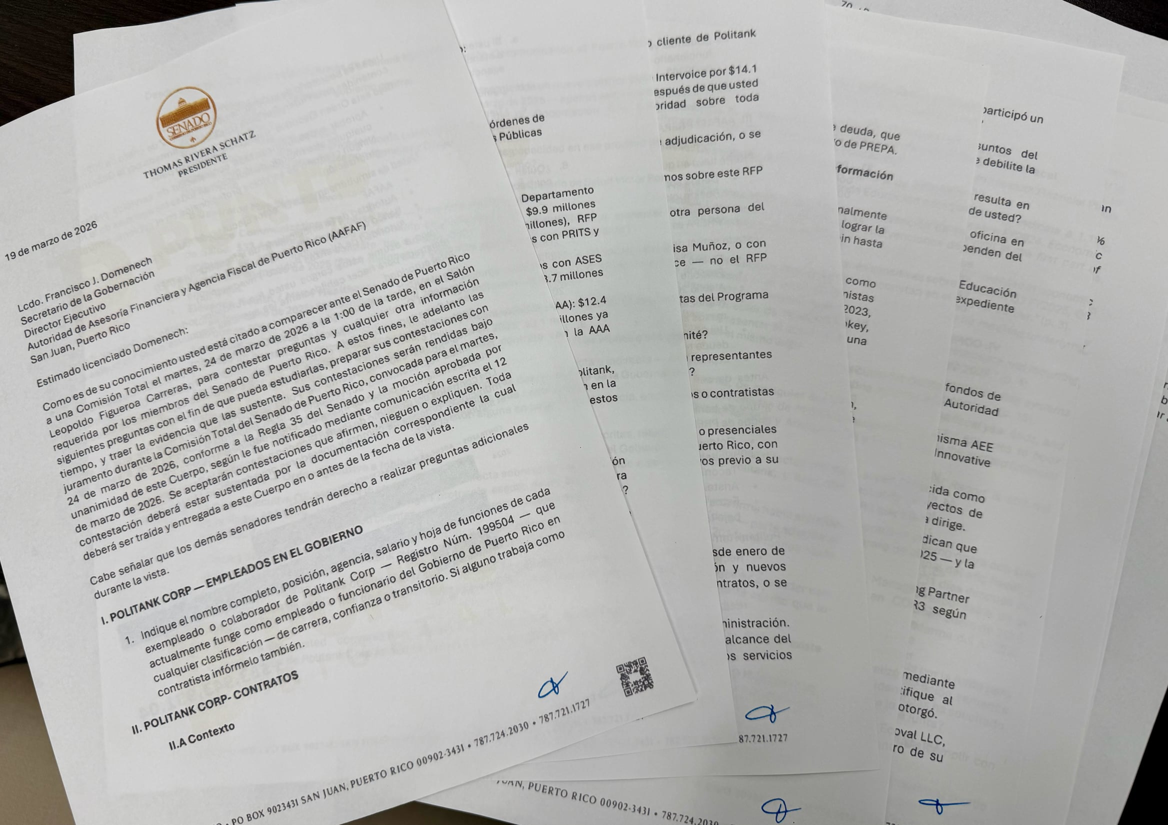 El Senado de Puerto Rico citó al secretario de la Gobernación, Francisco Domenech, a una comisión total mediante un documento oficial que perfila una pesquisa amplia sobre contratación gubernamental, incluyendo vínculos con la firma Politank, adjudicaciones en múltiples agencias y posibles conflictos de interés, según la carta firmada por el presidente senatorial Thomas Rivera Schatz.