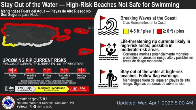 [Apr 1, 2026] Multiple hazards / Múltiples amenazas: Life-threatening rip currents & dangerous surf en PR, Culebra, Vieques y USVI. Hazardous seas. Brief heavy showers may cause ponding/inundaciones menores. Stay out of the water / Evite el agua. #PRwx #USVIwx pic.twitter.com/r6gCqrLhIP